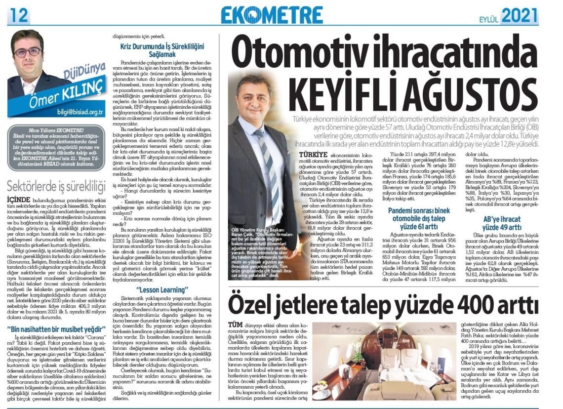EKOMETRE Gazetesi ve ekometre.com da BİSİAD – Bilişim Sektörü İş Adamları ve Profesyonelleri Derneği üyelerine özel tahsis edilmiş olan, “DijiDünya” adlı köşemizin Eylül ayı yazısı yönetim kurulu üyemiz Sn.Ömer KILINÇ tarafından “Sektörlerde İş Sürekliliği” başlığı altında kaleme alındı.